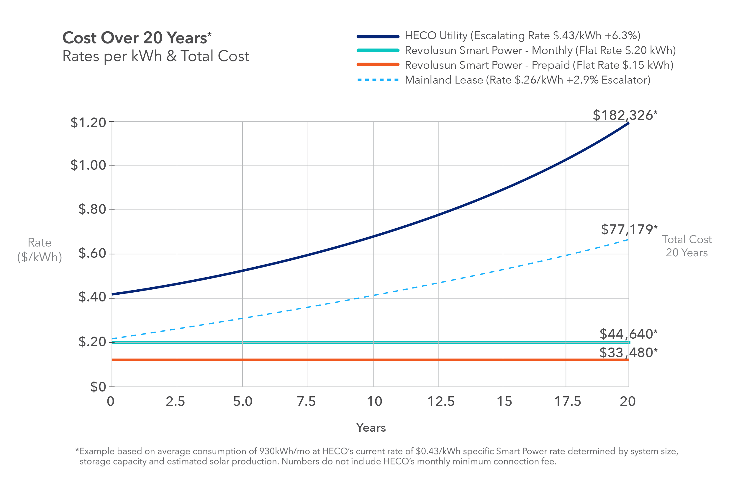 *Estimates are based on an average household using 930 kWh/month. Your actual energy use, system size, and savings may differ. Utility rates and escalators are based on public information and assumptions. Future rates may be higher or lower than shown.“Mainland Corporate Lease” reflects common industry structures and is not tied to any one company or contract. RevoluSun’s Smart Power leases are subject to credit approval, site conditions, and contract terms. Savings are not guaranteed. Consult a tax professional regarding any state or federal tax incentives. Numbers do not include HECO’s monthly minimum connection fee.